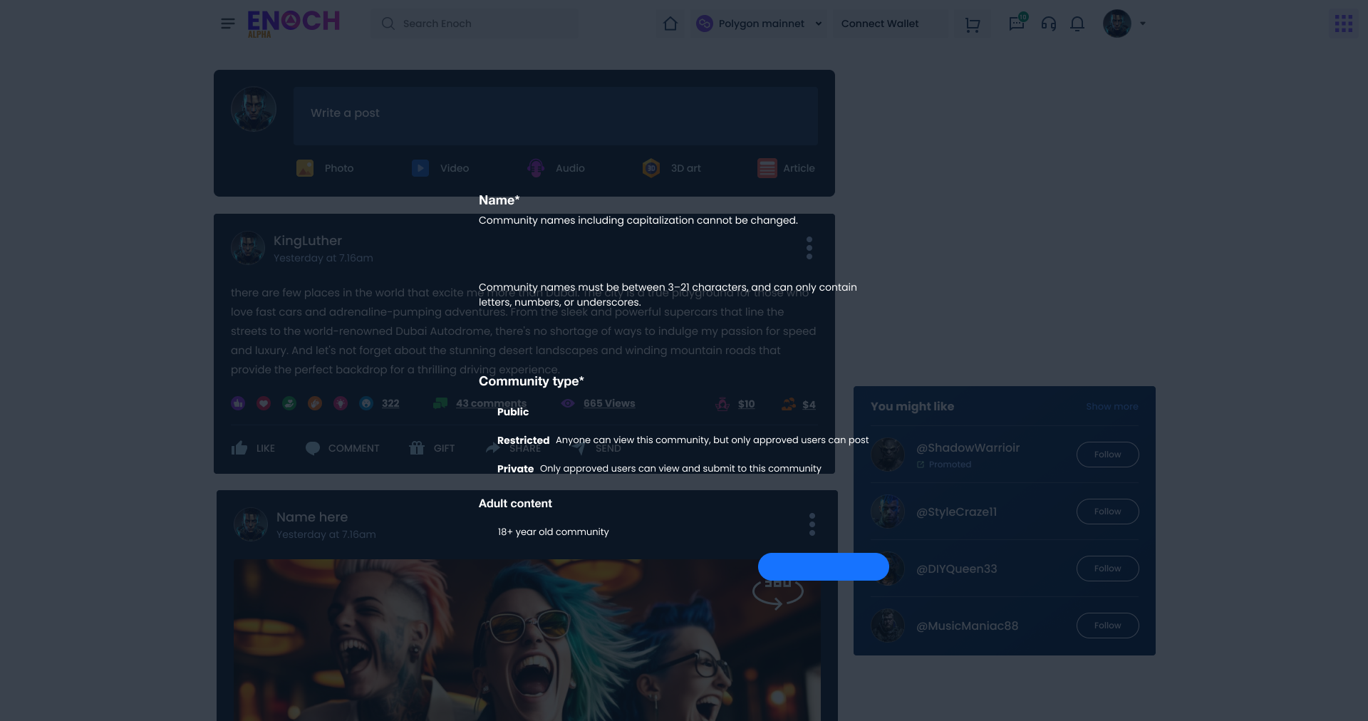 &#x20;Enoch communities offer a great way for users to connect with like-minded people, share knowledge, and collaborate. Whether you want to create a community or join an existing one, Enoch has made it easy and intuitive for you to do so.