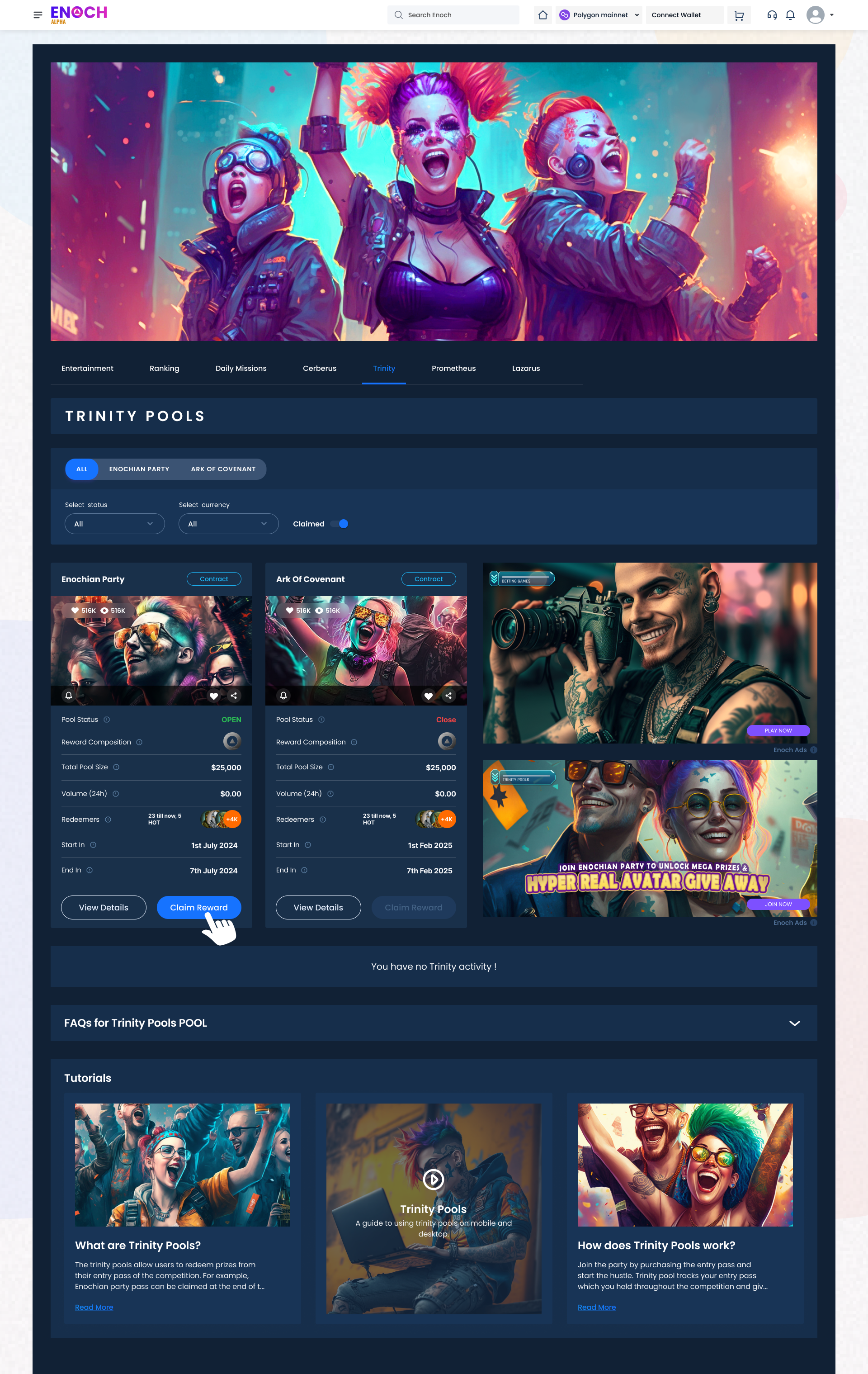 Welcome to Enoch Trinity Pool, a unique feature that allows users to earn rewards for their XP points. In Trinity Pool, users can claim rewards in the form of Enoch coins and NFTs for the XP points they have earned.