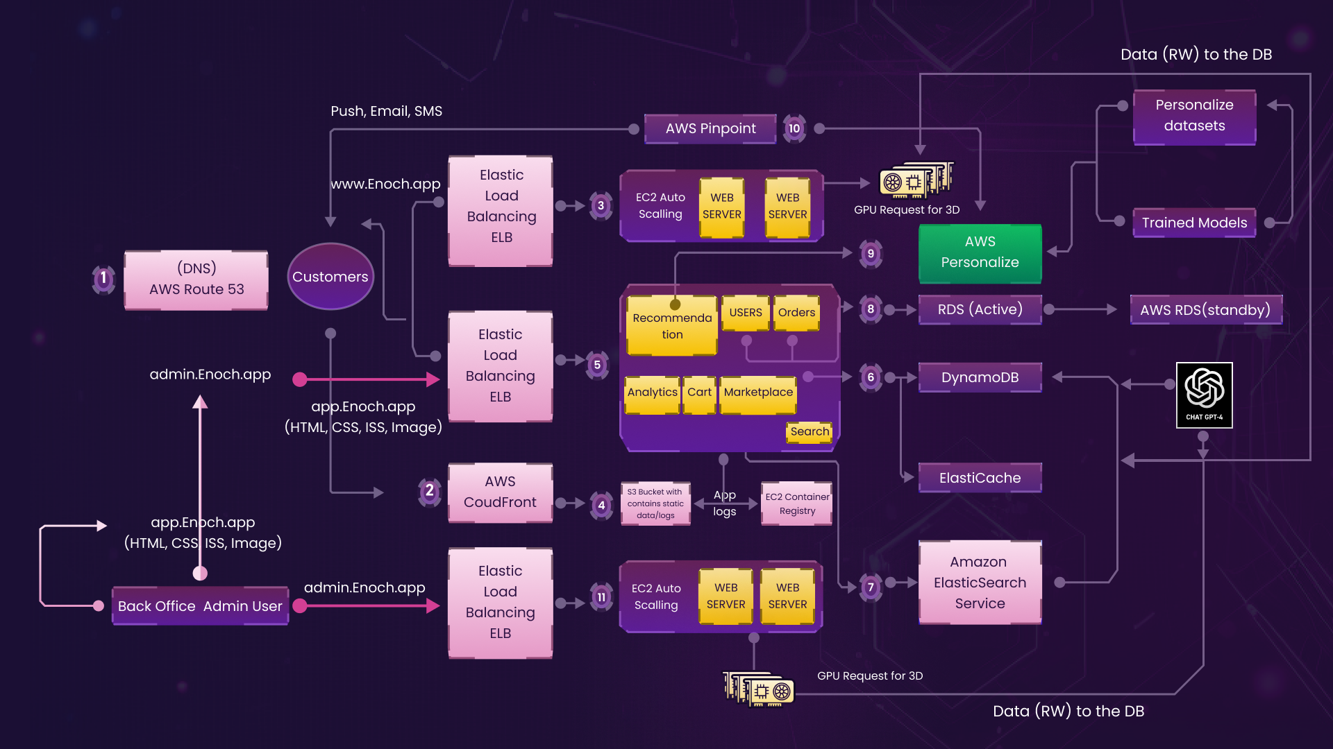 Enoch is an application that runs on a cloud infrastructure, taking advantage of AWS services such as AWS CloudFront, Elastic Load Balancing (ELB), DynamoDB, ElastiCache, Amazon ElasticSearch Service, AWS Personalize, and AWS Pinpoint, to provide its services. The application also uses trained models and ChatGPT4 for 3D modeling and EC2 auto-scaling to ensure optimal performance. With these services, Enoch can deliver its services seamlessly and at a low cost, making it an excellent choice for users.